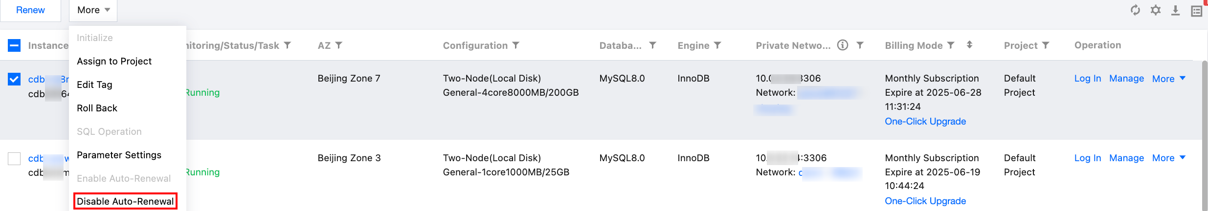 1. Log in to the MySQL console and find one or more TencentDB for MySQL instances for which you want to cancel automatic renewal. 2. Select the target instance, and select More > Disable Auto-Renewal above.