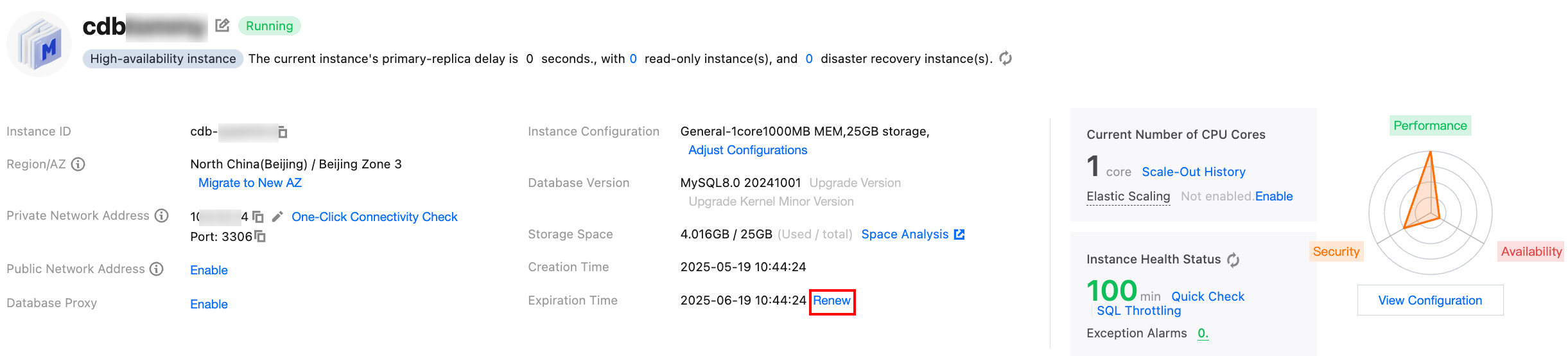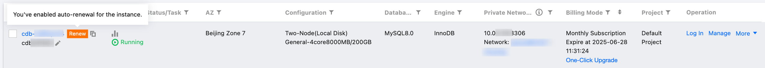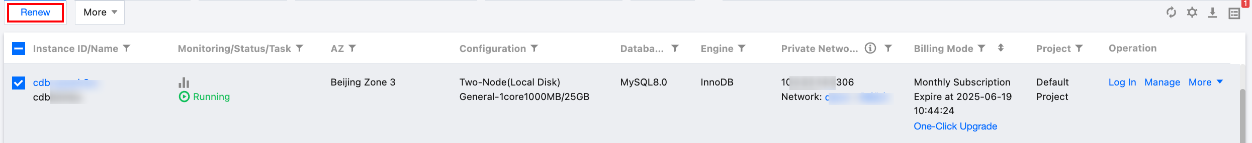 Log in to the MySQL Console. In the instance list, click Instance ID to go to the instance details page. Click Renew after the Expiration Time. III. Managing Manual Renewal