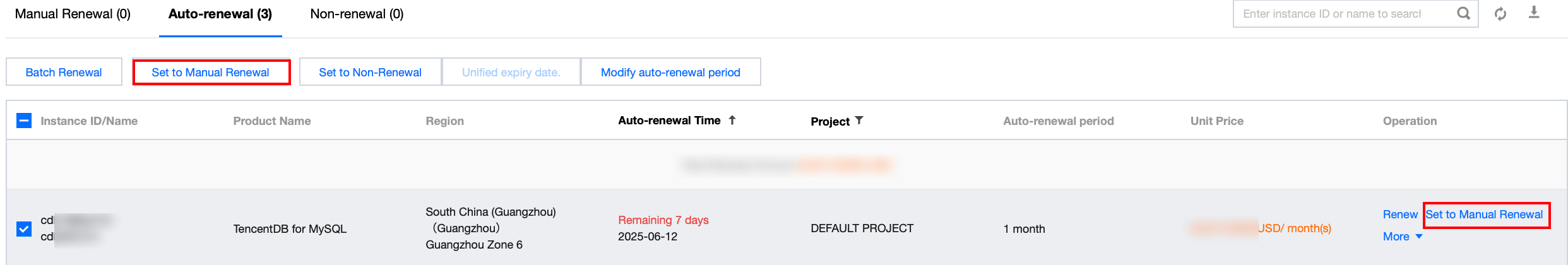2. Below the automatic renewal items, find one or more TencentDB for MySQL instances for which you want to cancel automatic renewal. Select them and click Set to Manual Renewal.