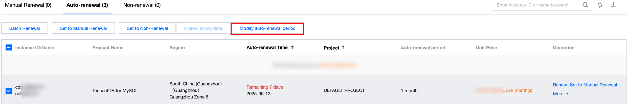 2. Below the automatic renewal items, find one or more TencentDB for MySQL instances for which you want to modify the automatic renewal cycle. Select them and click Modify auto-renewal period.