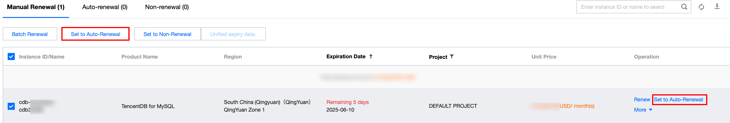 2. Below the manual renewal items, find one or more TencentDB for MySQL instances for which you want to set automatic renewal. Select them and click Set to Auto-Renewal.