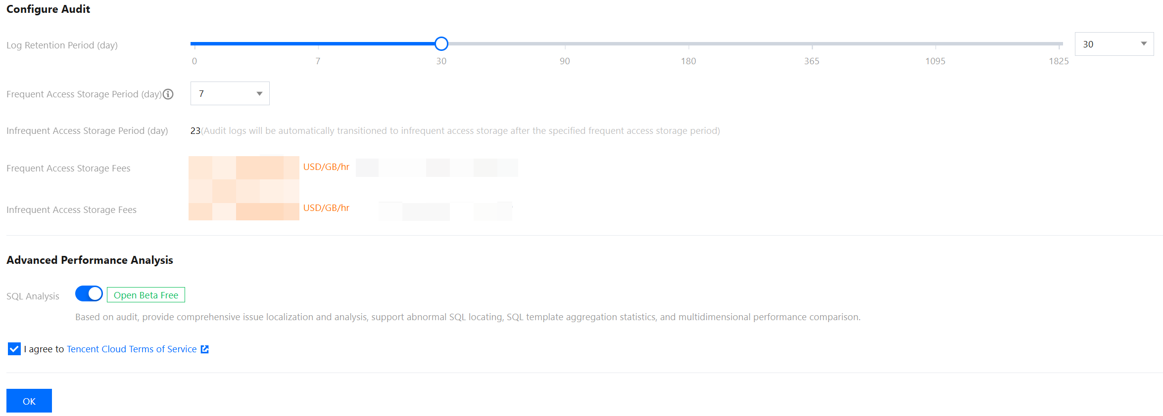 In the Configure Audit section, set Log Retention Period, Frequent Access Storage Period, and Infrequent Access Storage Period, read and indicate your content to the Tencent Cloud Terms of Service, and click OK. |
