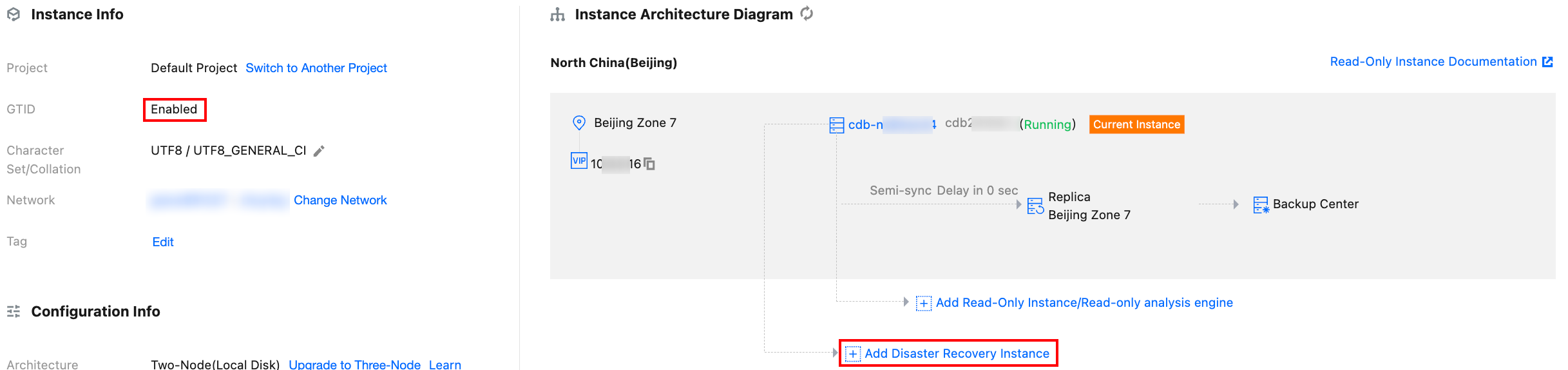 1. Log in to the TencentDB for MySQL console. In the instance list, click an instance ID or Manage in the Operation column to access the details page. 2. Make sure that the GTID feature is enabled by viewing the basic information of the instance on the Instance Details page. Click Add Disaster Recovery Instance in the instance architecture diagram to enter the disaster recovery instance purchase page.