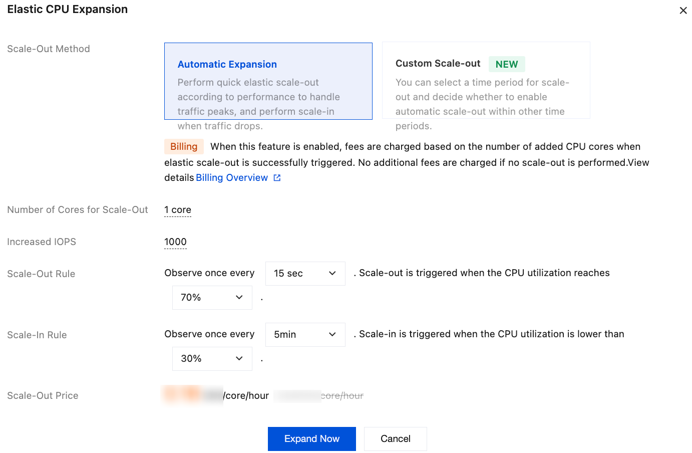 3. In the CPU Elastic Scaling window, complete the following configurations. Confirm the scale-out fees, and click scale out now.