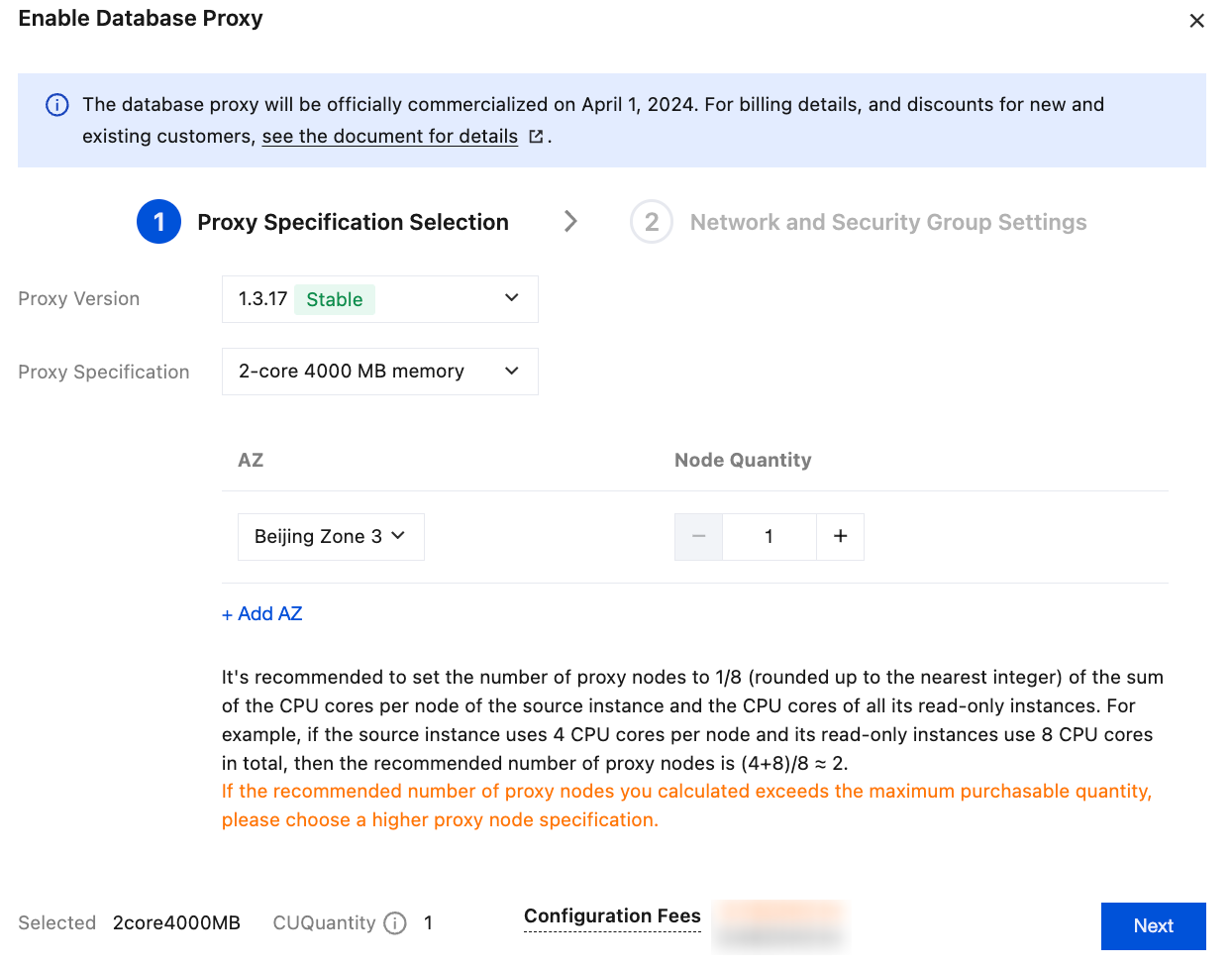 AZ and Node Quantity | 1. Select the database proxy AZ. You can click Add AZ to add more AZs. The number of selectable AZs depends on how many AZs are available in the current region. You can select up to three AZs. 2. Select the node quantity. We recommend you set the quantity to 1/8 (rounded up) of the total number of CPU cores on the source and read-only instances; for example, if the source instance has 4 CPU cores, and the read-only instance has 8 CPU cores, then the recommended node quantity will be (4 + 8) / 8 ≈ 2. Note: If the selected database proxy is not in the same AZ as the source instance, the write performance may drop when you connect to the database through the proxy. If the calculated number of proxy nodes required exceeds the purchase limit, we recommend that you choose a higher proxy specification. |