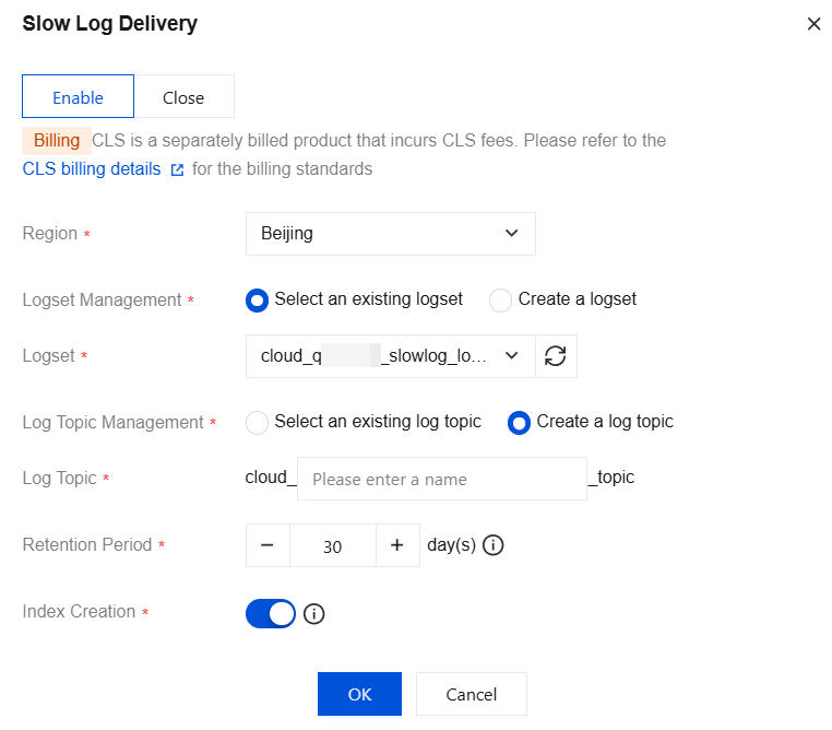 Retention Period | Select the retention period for the slow log data delivery, which defaults to 30 days. It allows you to choose between 1 to 3600 days, and the data will be automatically cleared after the logs expire. If an existing log topic is selected, the retention time will default to match the existing log topic's retention period. |