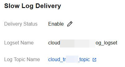 Logset | Select an existing logset: You can filter from the existing logset in the search box to categorize your slow log delivery. Create a logset: You can create a new logset to categorize your slow log delivery. The naming format for creating a logset is cloud_ custom_logset, where the custom field supports only letters, digits, and underscores, with a length of no more than 20 characters. |