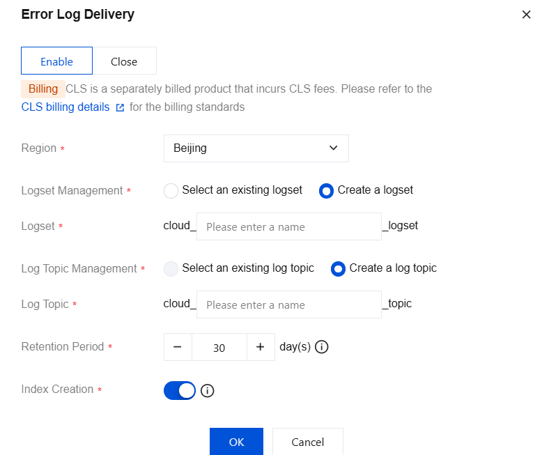 Index Creation | Enabled by default. Index configuration is critical for log retrieval and analysis in CLS. Only if the index is enabled, the log can be analyzed and retrieved. Learn More. If an existing log topic is selected, the index status will default to match the existing log topic's index status. |