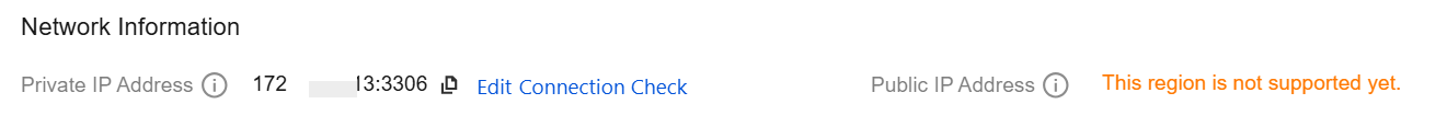 Public network access can be enabled for main instances deployed in Guangzhou, Shanghai, Beijing, Chengdu, Chongqing, Nanjing, Hong Kong (China), Singapore, Seoul, Tokyo, Silicon Valley, Virginia, and Frankfurt. For the latest information about the regions where public network access can be enabled for read-only instances, please refer to the console. If your instance is deployed in a region where public network access is not supported, public network access cannot be enabled.