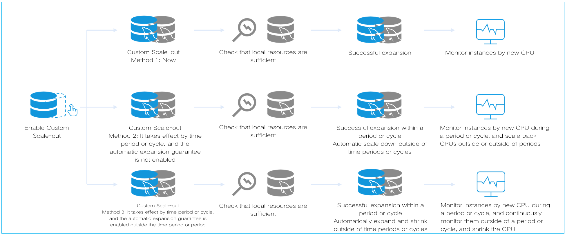 If an instance with the CPU elastic scale-out feature enabled needs to adjust configuration, note that the feature will be disabled after the adjustment is completed. Promptly monitor whether the CPU meets business needs after adjustment. If you want to use the feature again, re-enable it. If an instance with the CPU elastic scale-out feature enabled is migrated, including user-initiated migration or synchronous migration during processes (such as primary instance upgrade migration along with read-only instance upgrade migration scenarios), note that the feature will be disabled after the migration is completed. Promptly monitor whether the CPU meets business needs after adjustment. If you want to use the feature again, re-enable it.