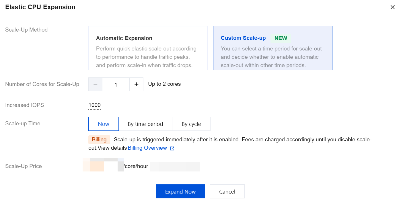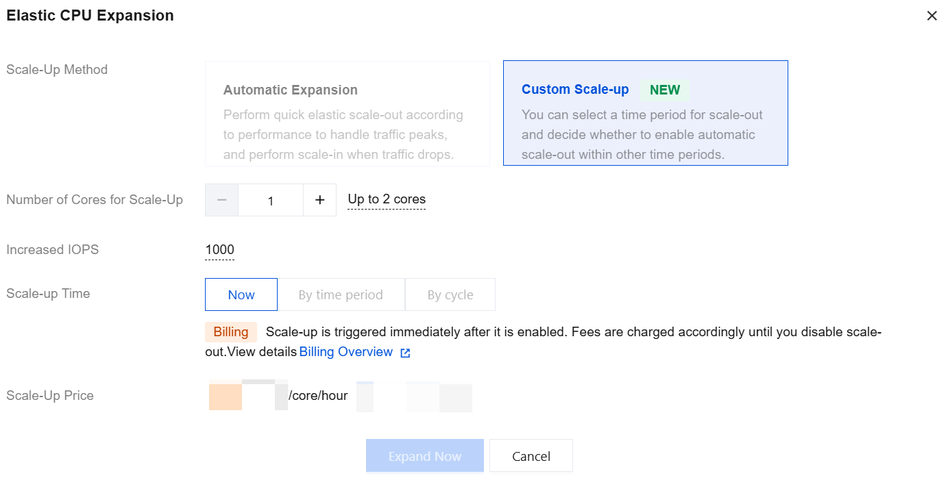 Scale-up Time: Selecting Now indicates that scale-up is triggered immediately after the feature is successfully enabled. After scale-up, automatic scale-down is not allowed. Manually disabling scale-up is required, and then it can be immediately scaled down to the original CPU core number.