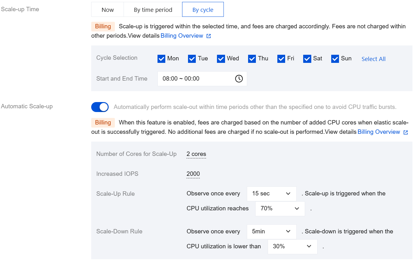 Scale-up Time: Selecting By cycle indicates that scale-up is triggered within the selected cycle after the feature is successfully enabled. If automatic scale-up is not enabled, scale-down will be performed within other cycles.