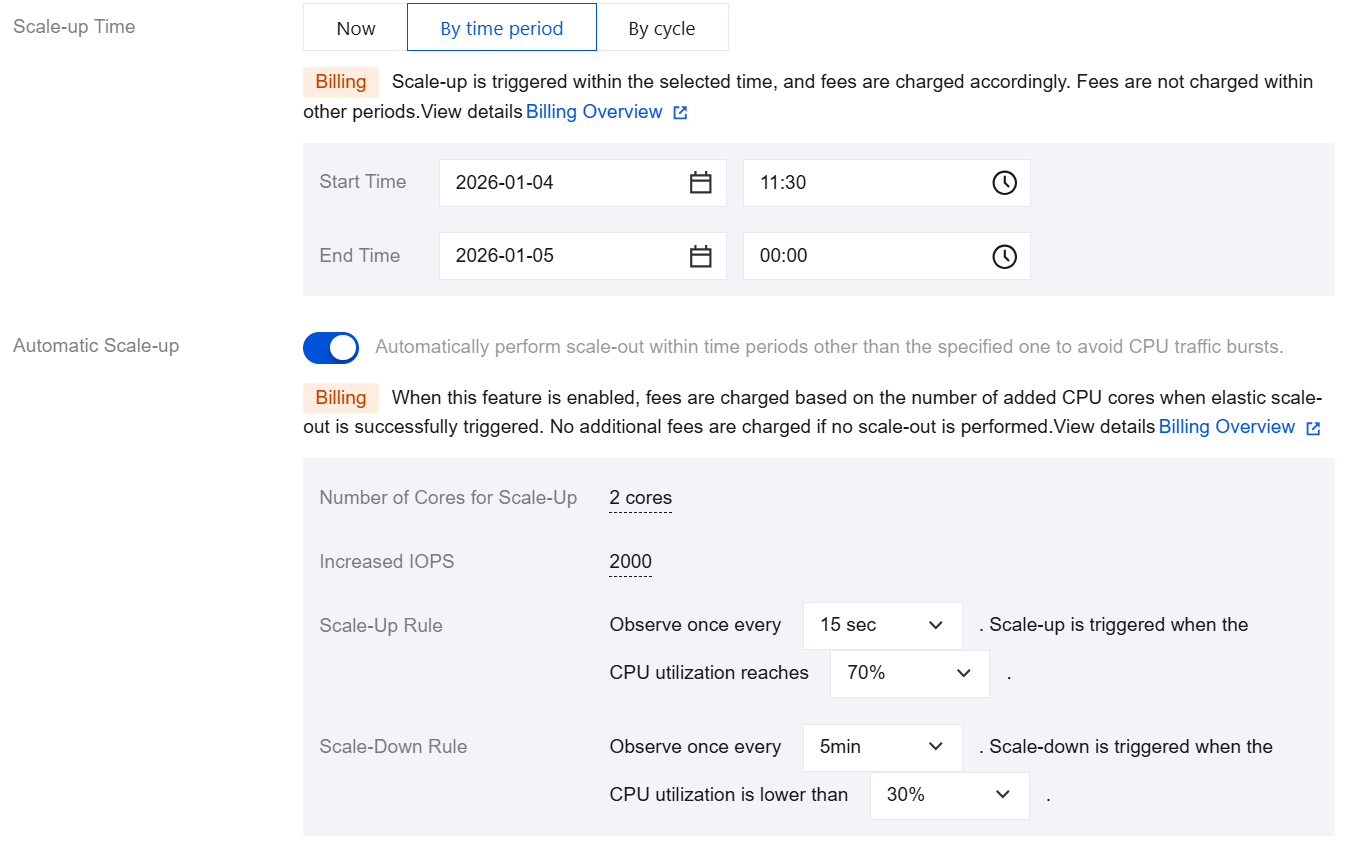 After custom scale-up is enabled, only adjustments to the current CPU elastic scale-up policy for the instance are supported. If you want to change it, first disable CPU elastic scale-up, and then re-enable it while changing it to the new policy. For example, if the current policy is custom scale-out of 2 cores with scale-up time being now, you are only allowed to adjust the number of cores for scale-up through the Modify operation. Changing the scale-up method or time is not supported through this operation.