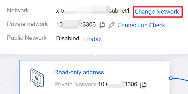 1. Log in to the MySQL Console. In the instance list, click Instance ID or Manage in the Operation column to enter the Instance Details page. 2. On the Instance Details page, choose Instance Architecture Diagram, and click Change Network in the preview window of Read-Only Address.