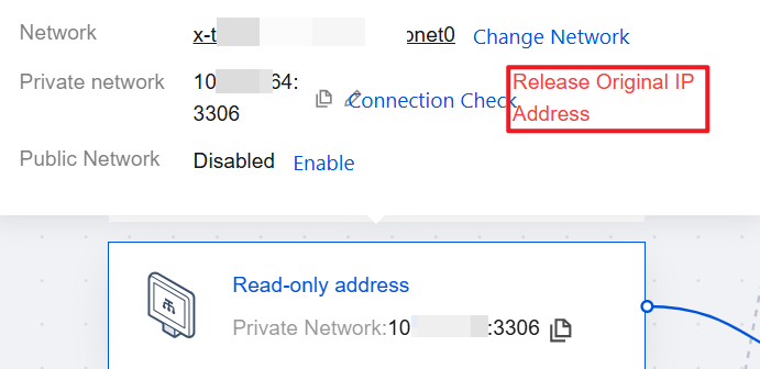 If the old IP address recycling time is set to a non-zero value, the old IP address will be reclaimed after the set duration following a network change. To release the old IP address in advance, go to the Instance Details page, choose Instance Architecture Diagram, and click Reserved Original IP Address in the preview window of Read-Only Address to perform immediate release on the target address.