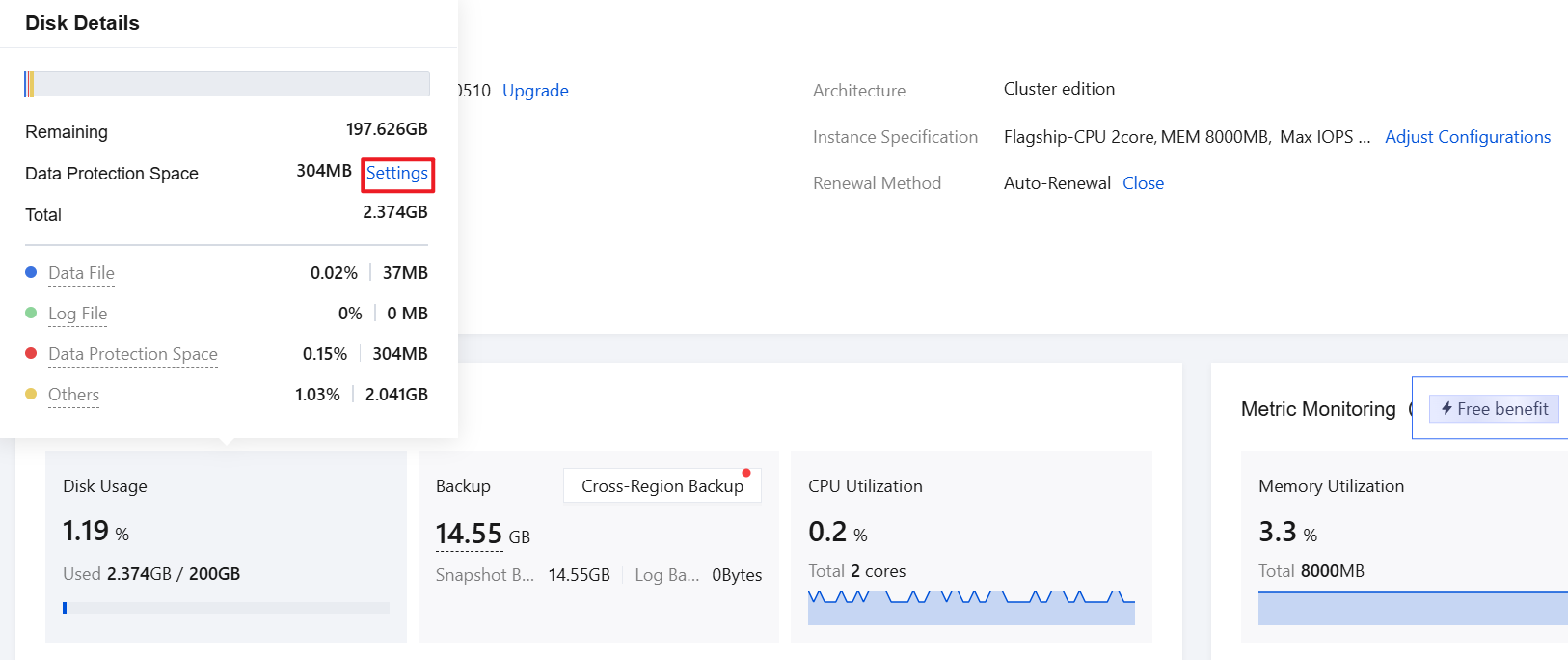1. Log in to the MySQL Console. In the instance list, click Instance ID or Manage in the Operation column to enter the Instance Details page. 2. Choose Resource Usage > Disk Usage. In the displayed preview window, click Settings next to Data Protection Space.