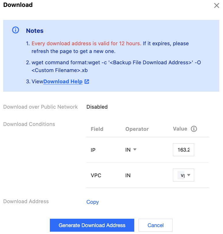 4. Click Download. In the pop-up window, set the download conditions, then click Generate Download Address. After successful generation, you can copy the link and use the wget command to download files.