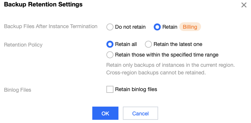 Binlog Files | When "Retain all" or "Retain those within the specified time range" is selected for Retention Policy, this parameter is displayed, and you can choose whether to retain binlog files. |
