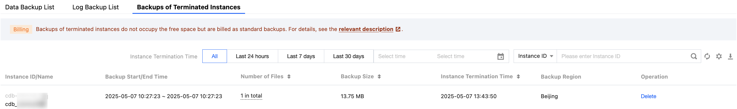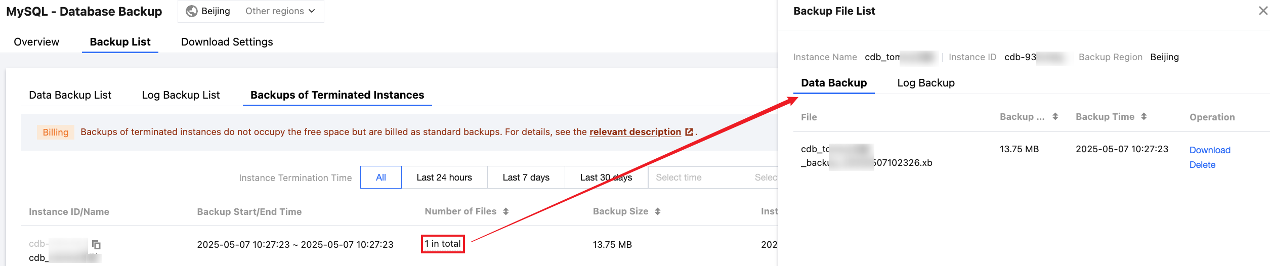 For instances whose backup files are retained after termination, their backups can be queried and downloaded through the database backup page after the instances are terminated and removed.