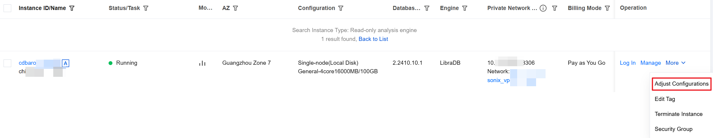 2. Find the read-only analysis engine instance that requires configuration adjustment in the instance list, and choose More > Adjust Configurations in the Operation column.