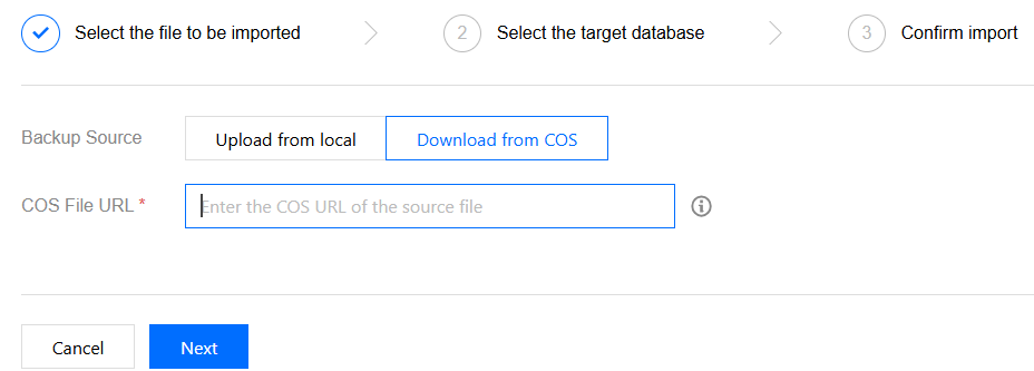 The SQL file import feature supports two methods: direct file upload or downloading from Cloud Object Storage (COS). To import SQL files to your TencentDB for MySQL using the COS download method, you need to first upload the file to COS to obtain the corresponding source file link. For detailed operations, see Appendix 1: Uploading Files to COS and Obtaining COS Source File Links. Directions