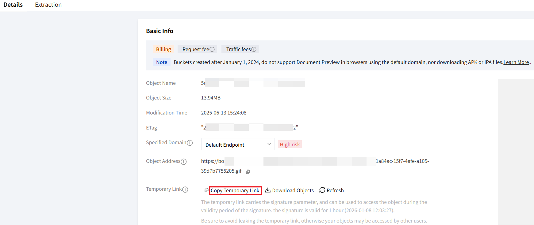 7. In the basic information section on the object details page, click Copy Temporary Link to obtain the COS source file link of the file.