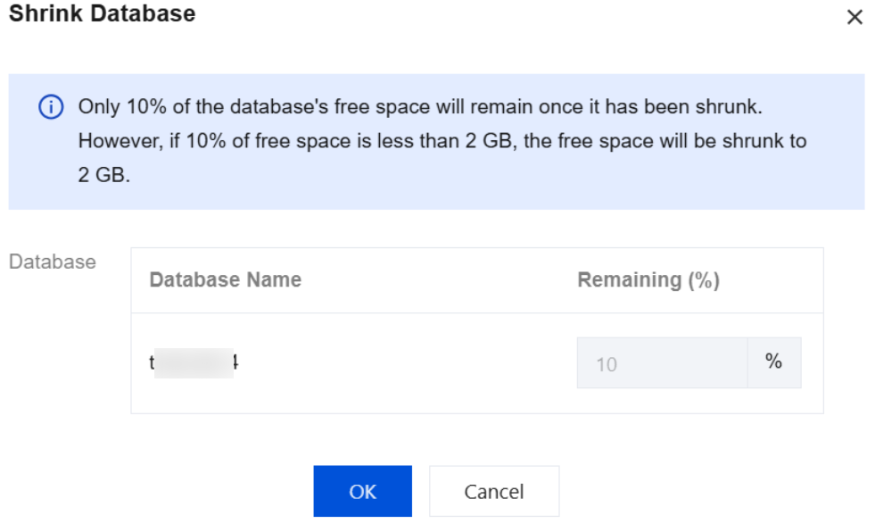 3. In the pop-up dialog box, the database name and the shrink ratio of the remaining space are displayed. Currently, only shrinking to 10% of the remaining space is supported. Click OK to proceed.