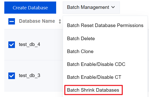 2. On the instance management page, select the Database Management tab, check the target database row, and choose Batch Management > Batch Shrink Databases above the list.