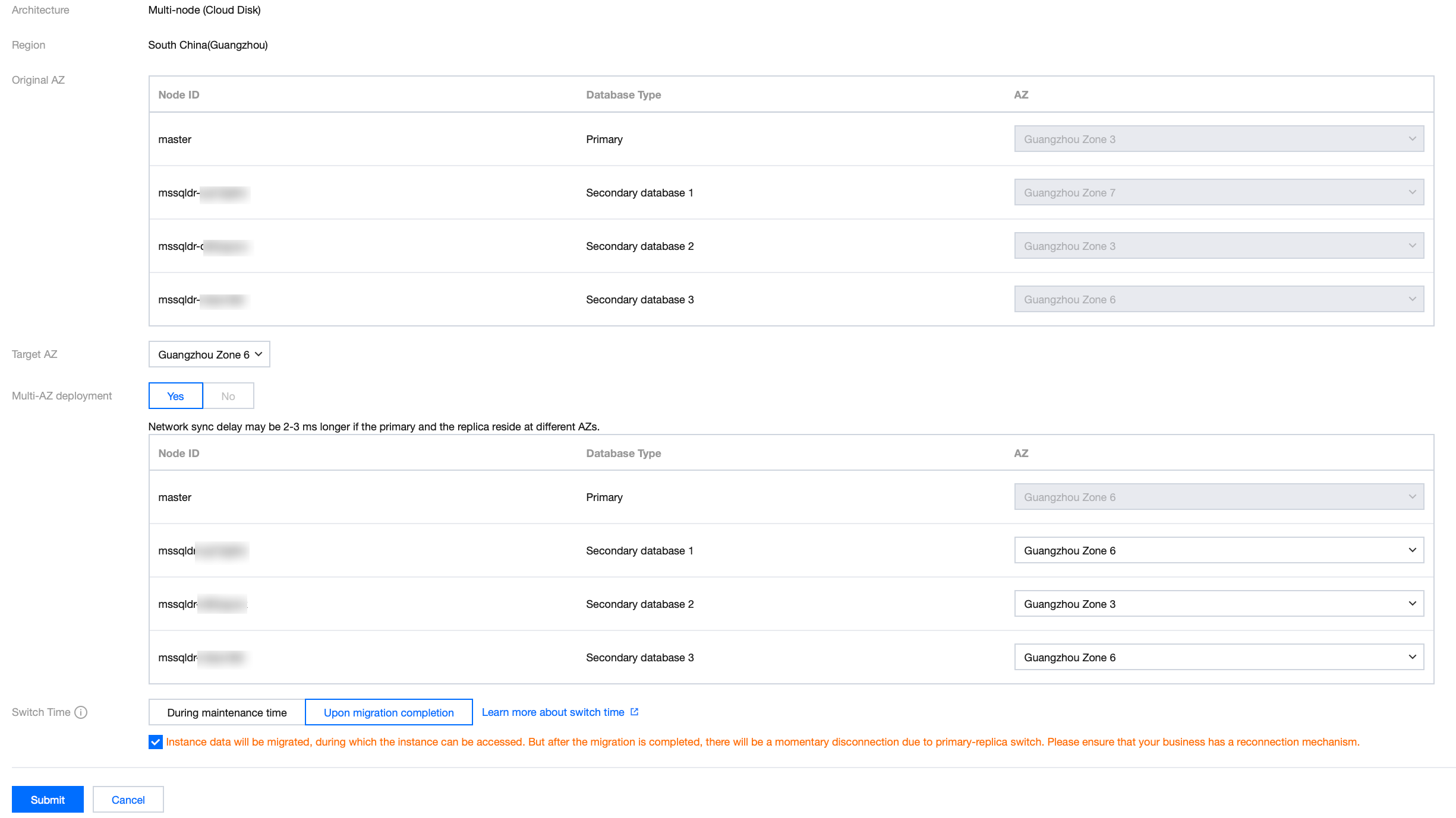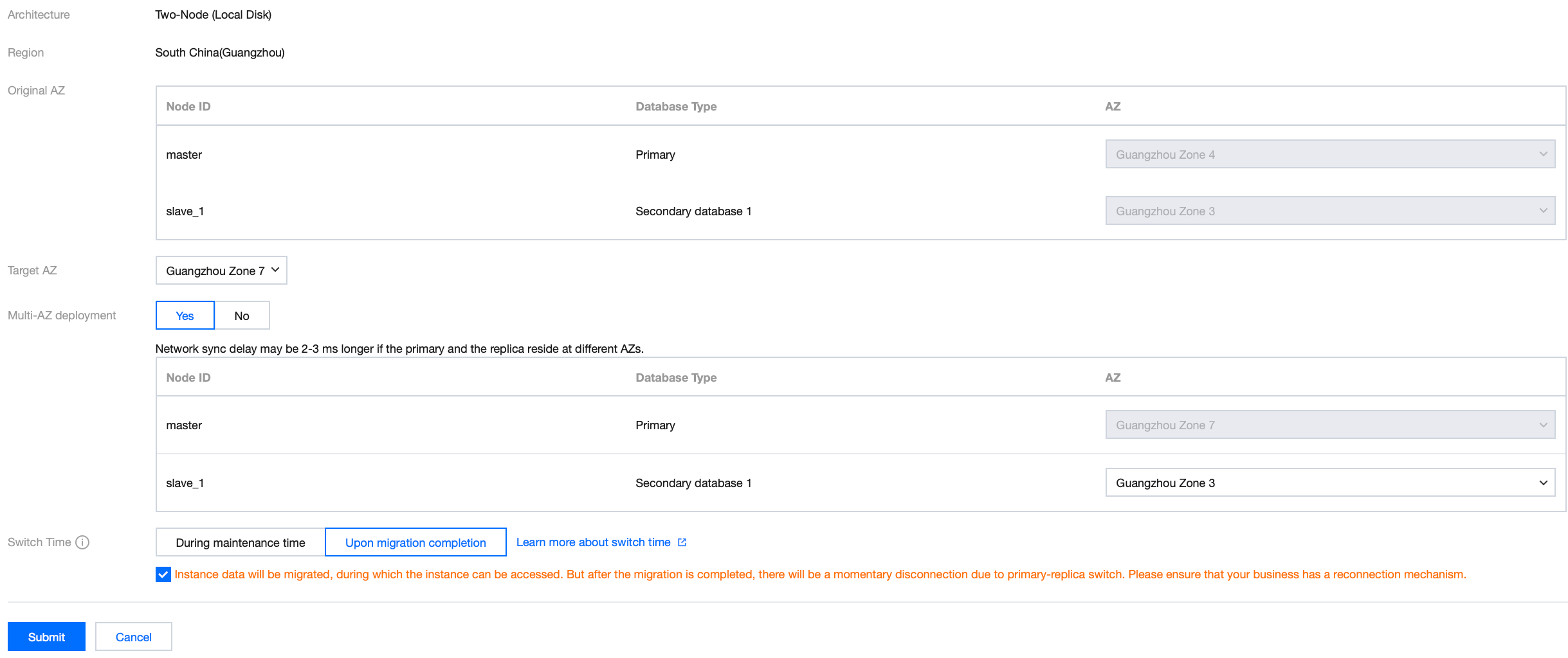 Time switch | Select the switch time for the cross-AZ migration operation. Within maintenance window: A switch will be performed within the maintenance window you have set after migration is completed. Upon migration completion: A switch will be performed immediately upon the completion of migration. |