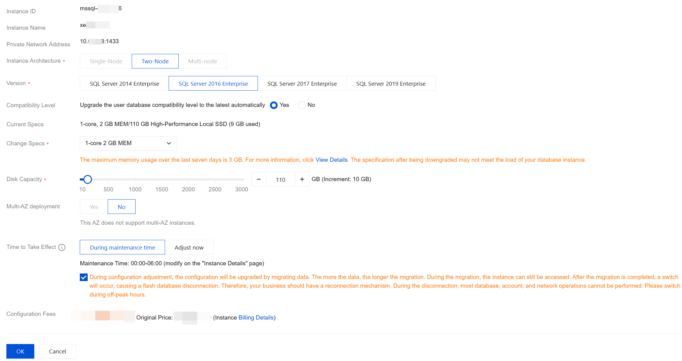 You can adjust the configuration of a TencentDB for SQL Server instance and its associated instances only when they are in running status and are not executing any tasks.