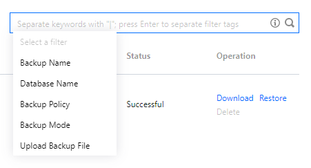 You can search for backup files in the search box on the right by database name, backup name, policy, mode, or file format. FAQs