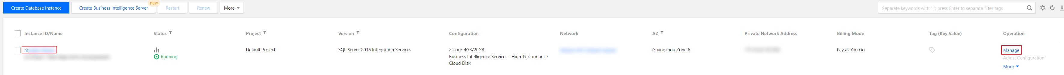 2. In the instance list, find the target business intelligence server and click its ID or Manage in the Operation column to enter the instance management page.