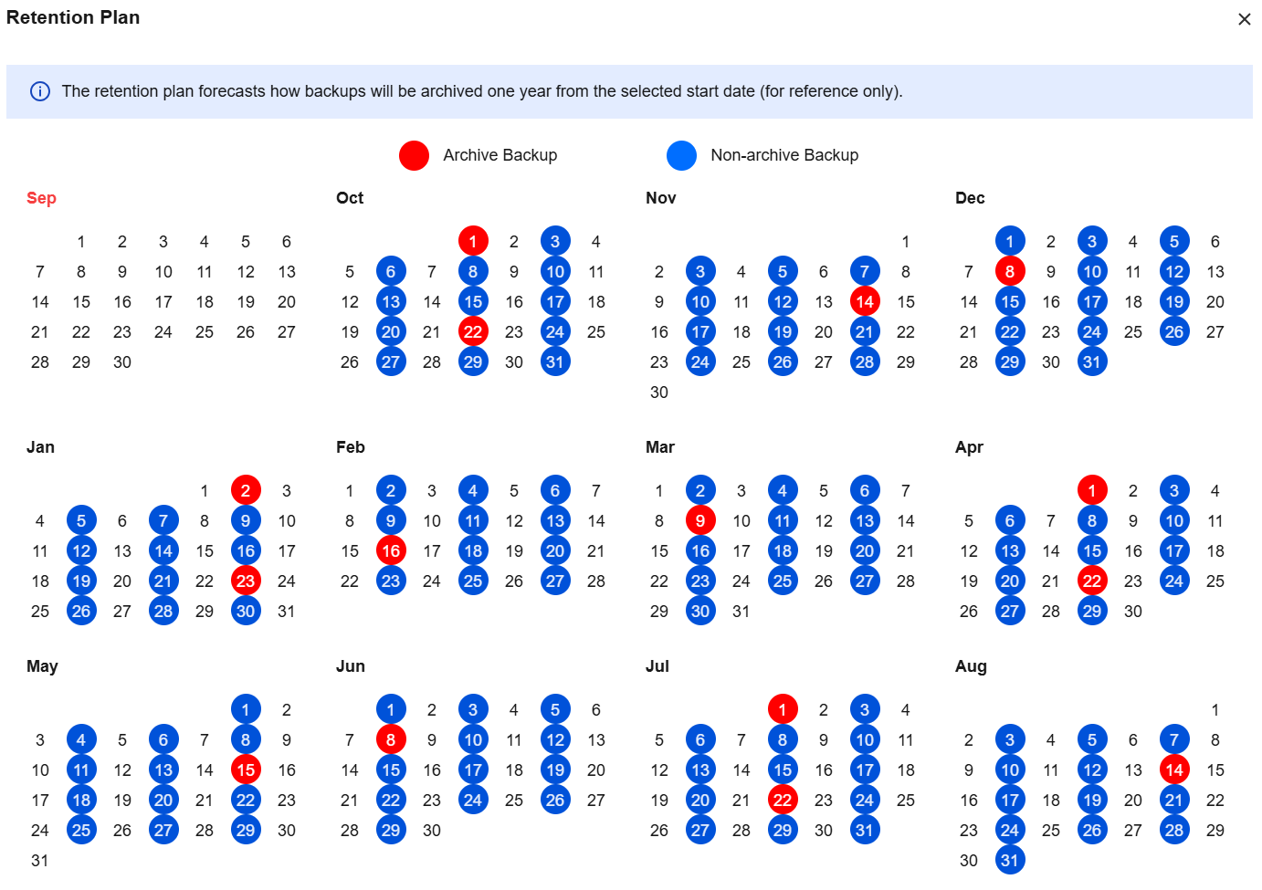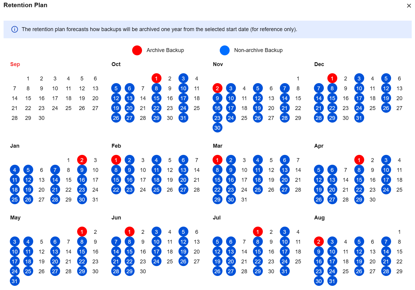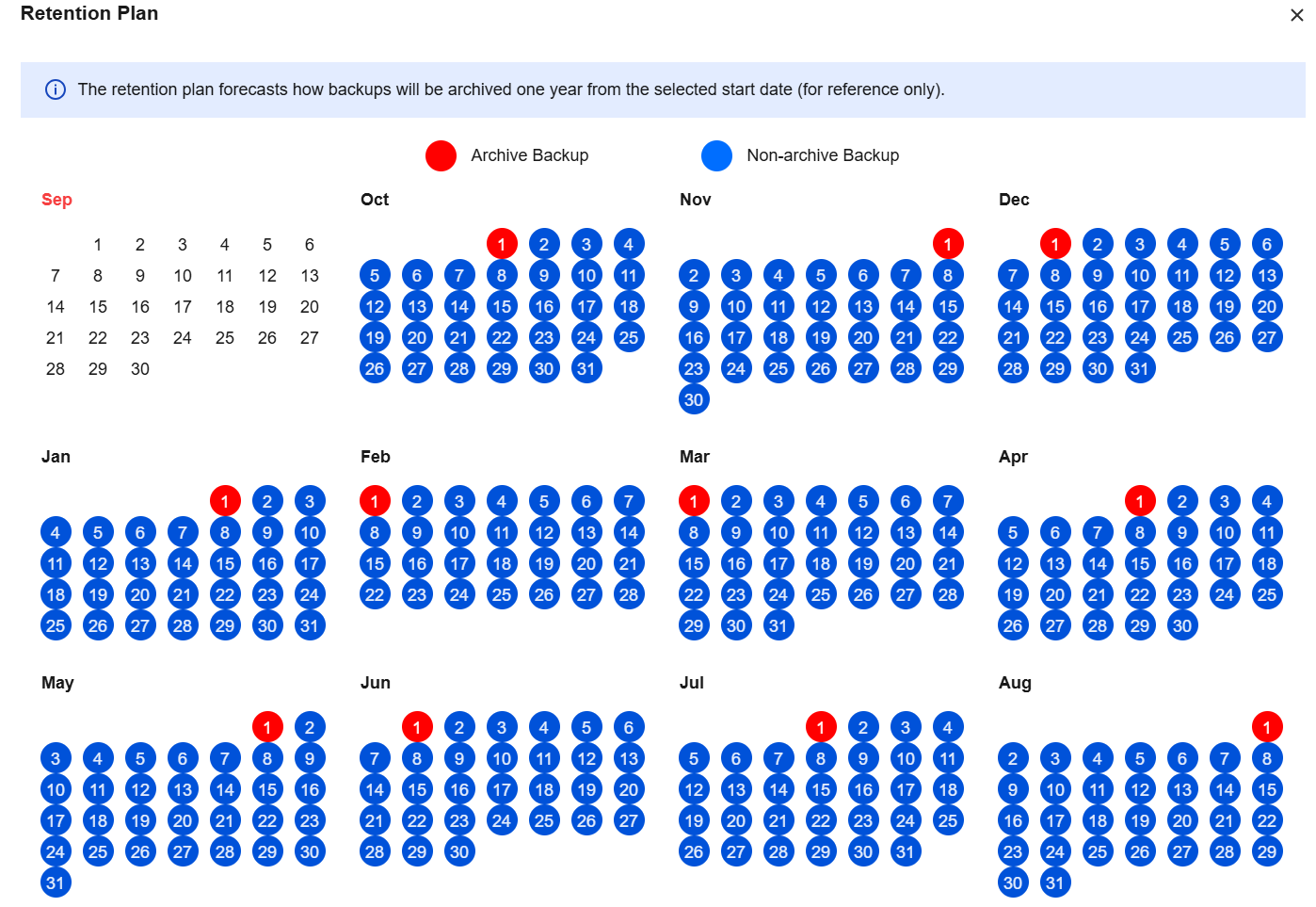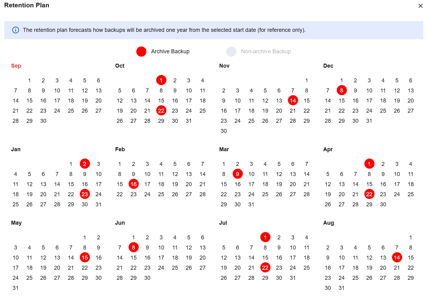 After setting the archive backup retention policy and start time, you can click View Retention Plan next to the start time to preview the backup plan.