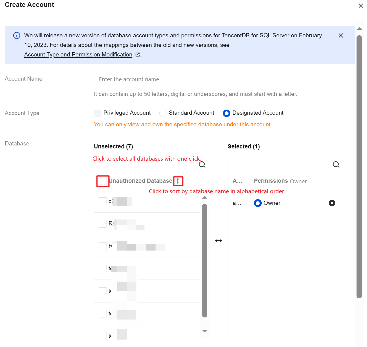 Account Type | Designated account description. Note: A designated account can only view and own the specified database. |
