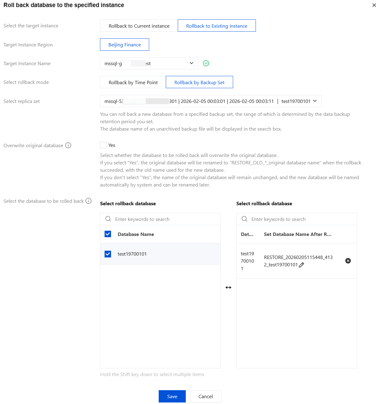Overwrite original database | Select whether the database to be rolled back needs to overwrite the original database. If you select Yes, once the rollback is successful: the original database will be renamed RESTORE_OLD_*_original database name. The new database obtained after the rollback will use the original database name.If the "Yes" option is left unchecked, after a successful rollback: the original database remains unchanged, while the newly rolled-back database will bear the user-defined name (defaulting to a system-generated name if not specified). |