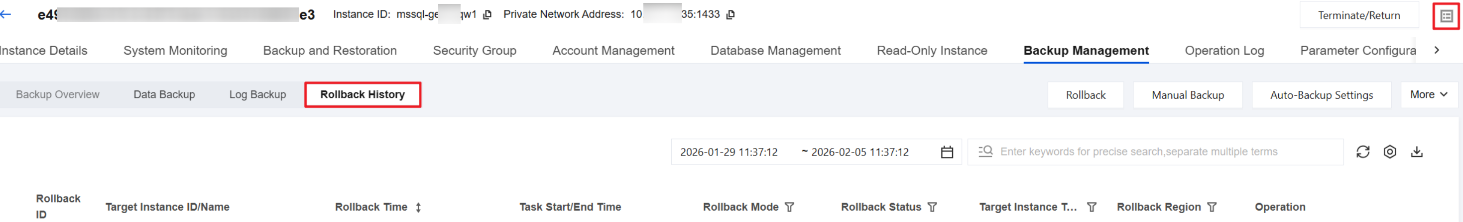 Select rollback mode | Select Rollback by Time Point. You can roll back the database to a specific time point from a source database instance. The time range dpends on the log backup retention period you set. |