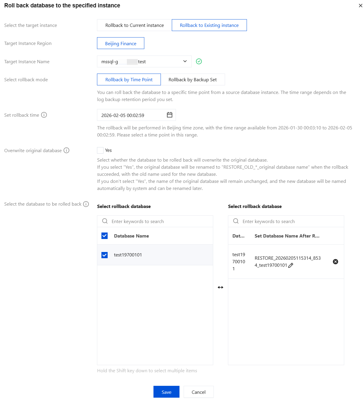 Overwrite original database | Select whether the database to be rolled back needs to overwrite the original database. If you select Yes, once the rollback is successful, the original database will be renamed RESTORE_OLD_*_original database name. The new database obtained after the rollback will use the original database name.If the "Yes" option is left unchecked, after a successful rollback: the original database remains unchanged, while the newly rolled-back database will bear the user-defined name (defaulting to a system-generated name if not specified). |