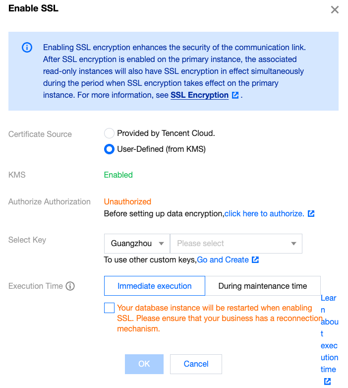 If no optional certificates are available or the existing certificates do not meet your requirements, click go to create to create a certificate in the KMS console, and then return to select the created certificate. 4. In the pop-up window, select the execution time, check the box stating, "Your database instance will be restarted when enabling SSL. Please ensure that your business has a reconnection mechanism." and then click OK.