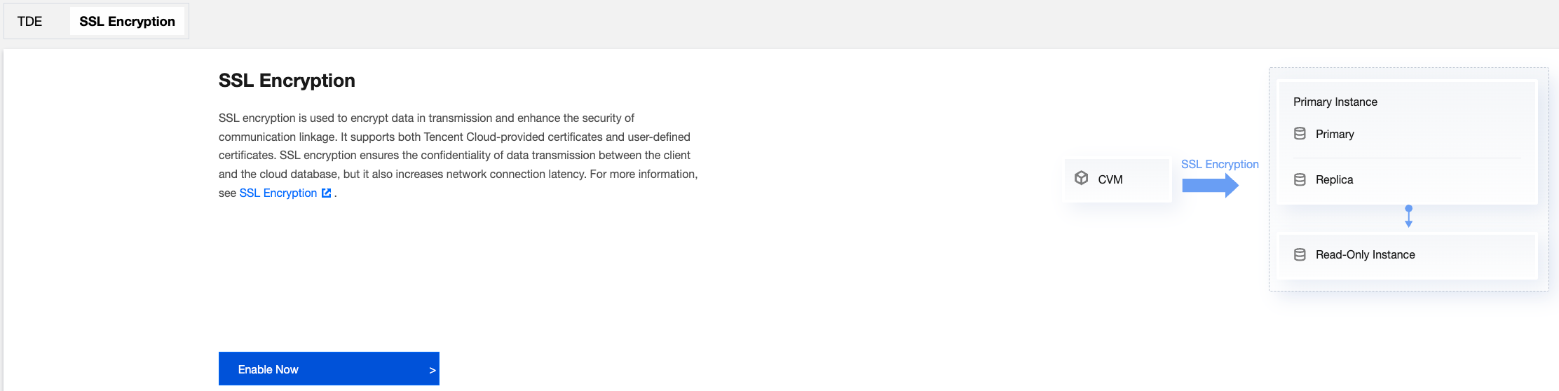 The database instances of all the architectures and versions of TencentDB for SQL Server support SSL encryption settings. In this settings, read-only instances do not need to be configured separately. Once SSL encryption is enabled on a primary instance, it will automatically apply to its read-only instances.