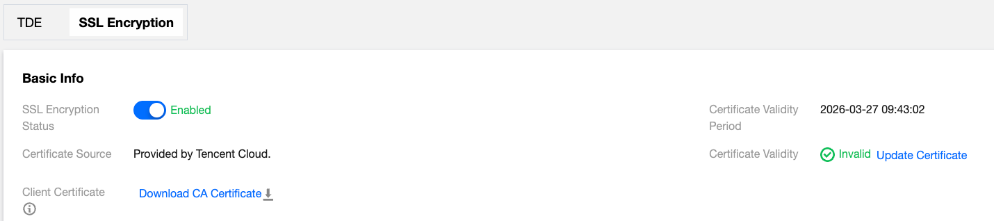SSL certificates have a validity period. When the certificate source is Tencent Cloud, the validity period is one year. When the certificate source is "user-customized", the validity period is the date configured when creating the custom key in the KMS console. Before the certificate expires, you need to manually update it to ensure that client programs using SSL-encrypted connections can continue to connect normally.