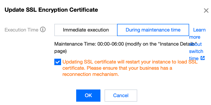 In the pop-up window, select the execution time, check the box stating, "Your database instance will be restarted when enabling SSL. Please ensure that your business has a reconnection mechanism." and then click OK.