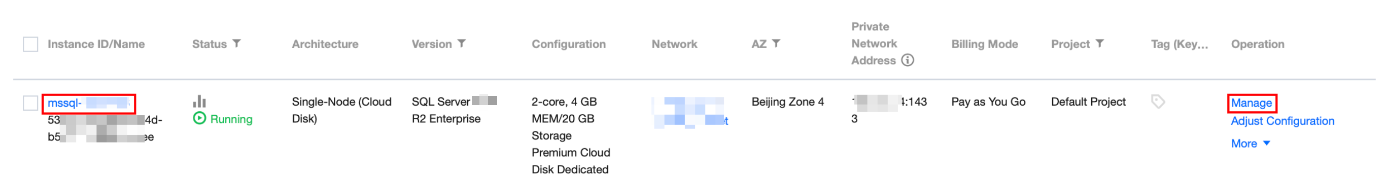 2. Select a region at the top, find the target instance, click Instance ID or click Manage in its Operation column to go to the instance management page.