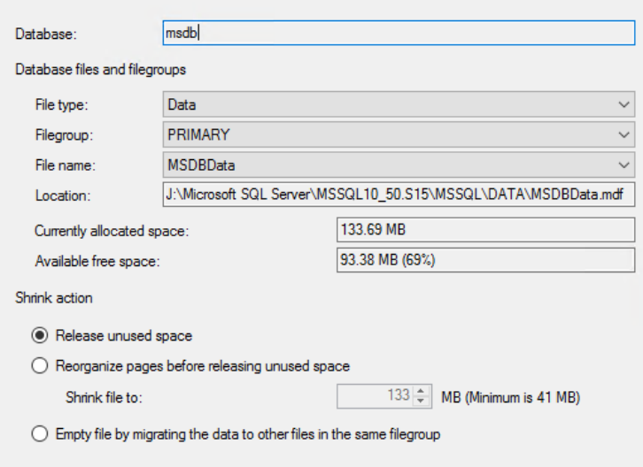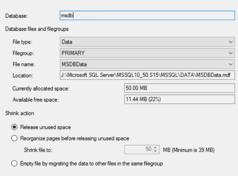 As shown in the figure above, the data file occupies 50 MB of disk space after the database shrink feature is used to reclaim part of the available free space.