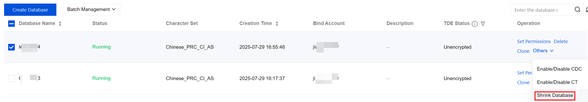 1. Log in to the TencentDB for SQL Server console and click Instance ID or Manage in the Operation column in the instance list to enter the instance management page. 2. On the instance management page, select the Database Management tab, locate the row where the target database is located, and select Others > Shrink Database in the Operation column.