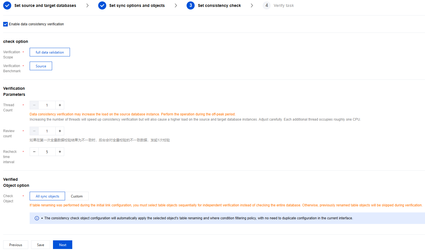 Thread Number Selection | The value range is 1–8. Select an appropriate value according to the actual situation. Increasing the number of threads can accelerate the consistency check speed, but it will also increase the load on the source and target databases. Please adjust the number with caution. Each additional thread approximately increases CPU usage by one core. The data consistency check may increase the load on the source database instance. It is recommended to perform operations during off-peak hours. |