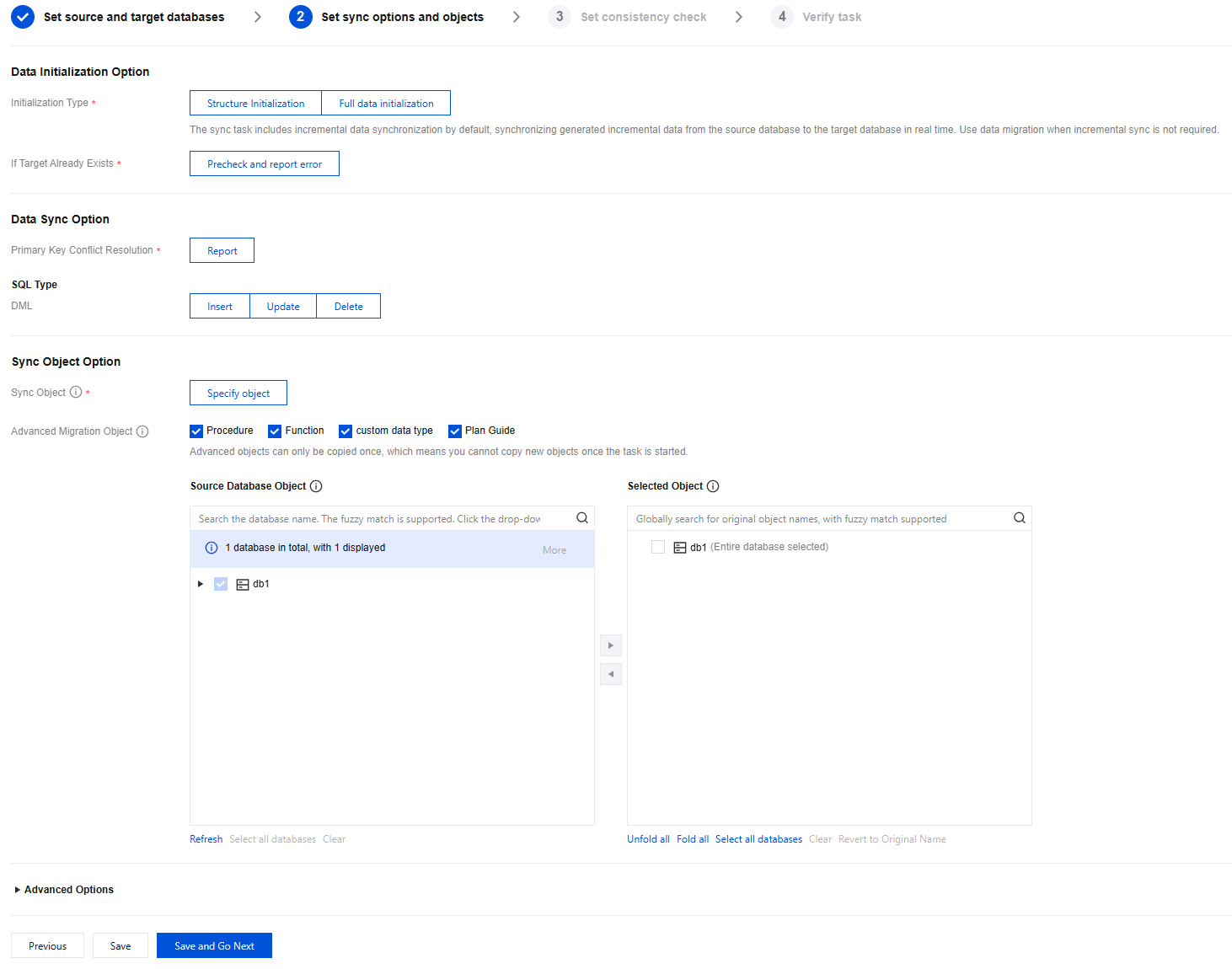 Advanced Migration Object | In addition to tables and views, select objects to be synchronized, such as procedures, functions, custom data types, and plan guides. Replication of advanced objects is a one-time operation; newly created advanced objects will not be synchronized after the task is started. Check the source databases to be synchronized in the source database list and add them to the list of selected objects on the right. |