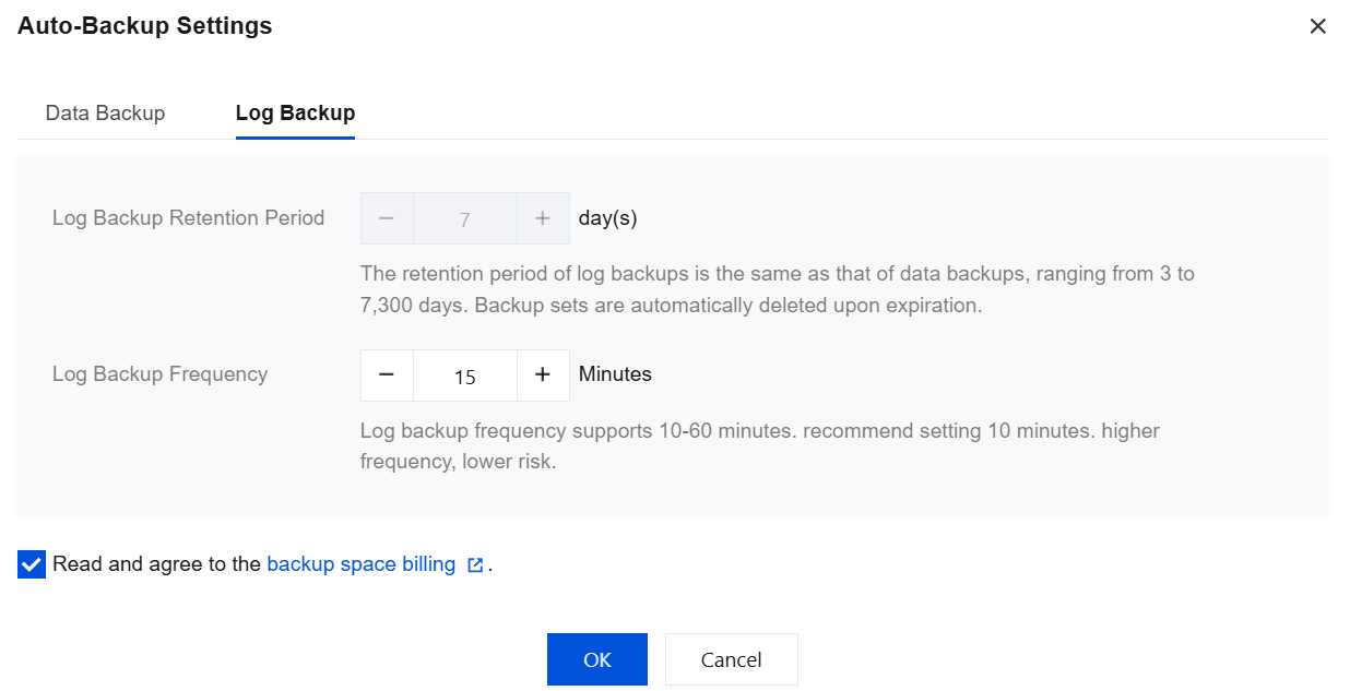 Log Backup Retention Period | By default, it is consistent with the data backup retention period. Range: 3 - 7300 days. Backup sets are automatically deleted upon expiration. |