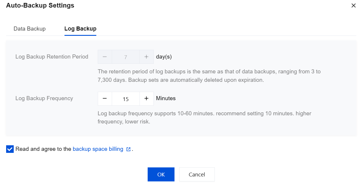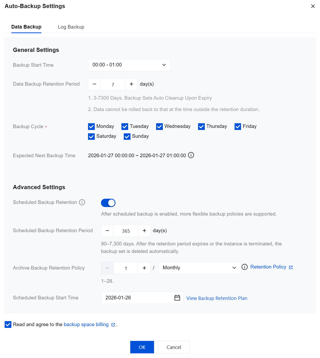 4. In the pop-up dialog box, complete the settings for data backup and log backup, read and select the Backup Storage Billing Notes, and click OK. Data Backup: The configuration items for data backup are set as follows.