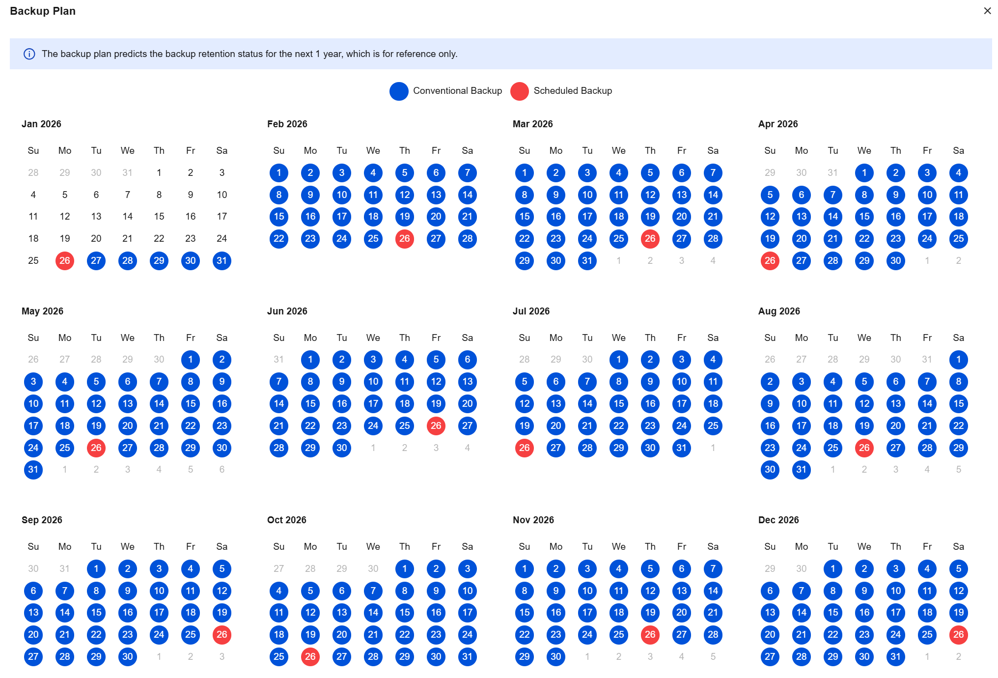 The backup plan preview currently shows the backup retention status for the next year, for reference only.