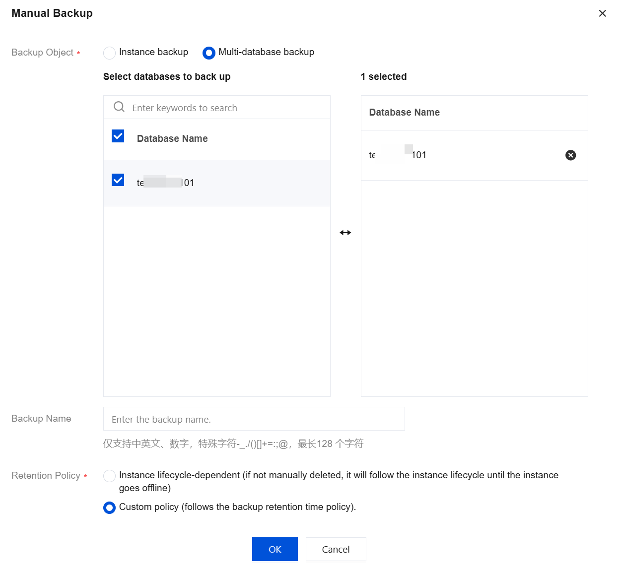 Backup Object | Select the target for manual backup. Instance backup: Perform backup for all databases of the entire instance. Multi-database backup: If you select multi-database backup, you need to choose the databases to be backed up. All databases can be selected with one click. |